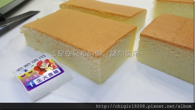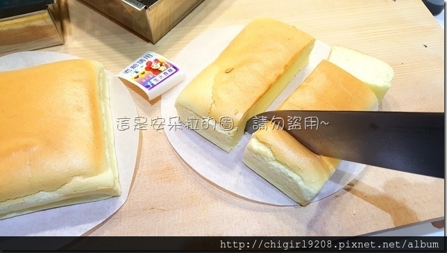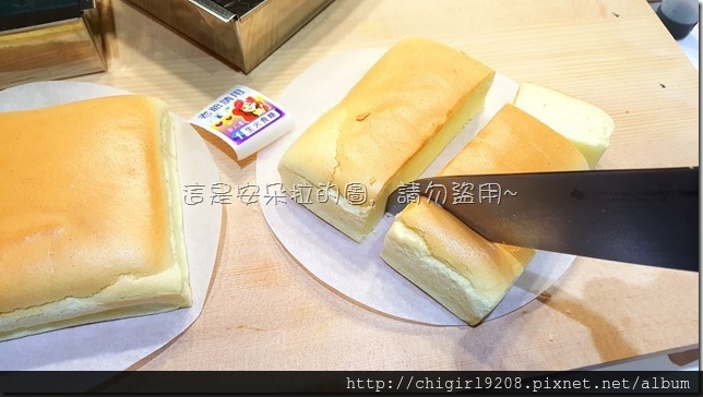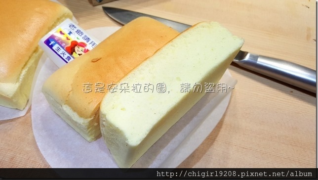 我這是趁熱切... 用菜刀... 柳宗理的廚房用刀... 要輕輕地切.. 不然刀子下去蛋糕也扁了..