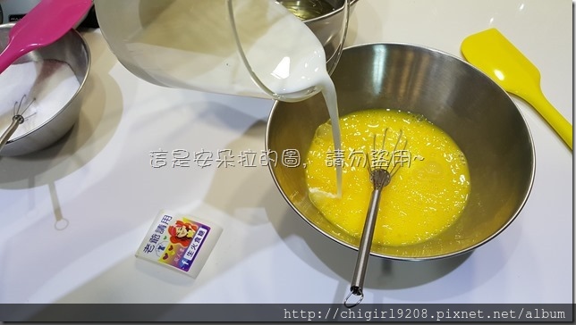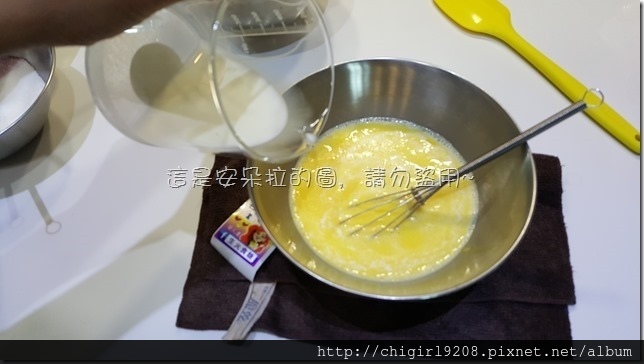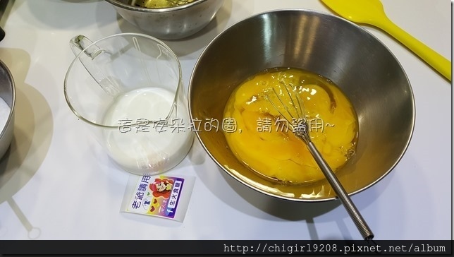 (1)蛋黃4個+一個全蛋+牛奶68 攪拌均勻
