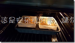 裝有麵糊的...烤模放在裝有熱水的烤盤裡頭,送進烤箱,中間往下一層。