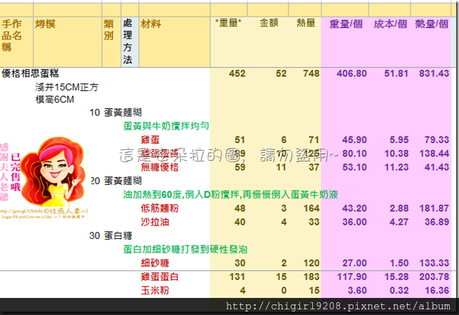 安朵拉實作的手作品:優格相思蛋糕 成本熱量分析如下.