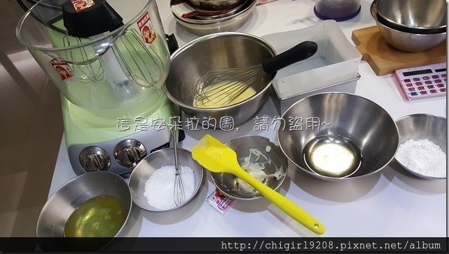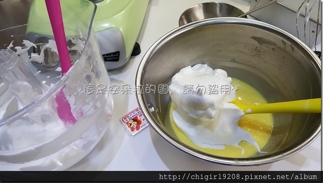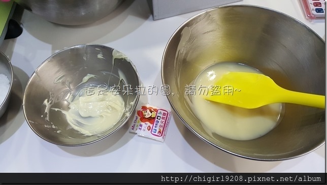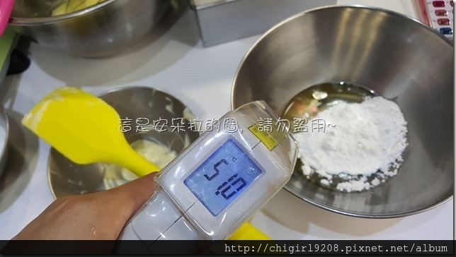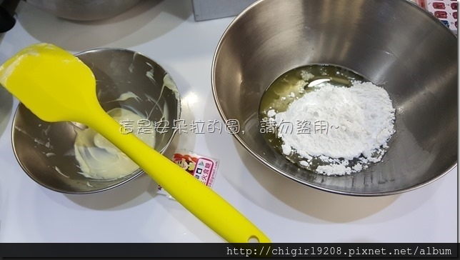 安朵拉將油加熱到60度,倒入D粉攪拌,再慢慢倒入蛋黃牛奶液