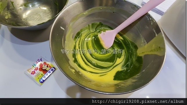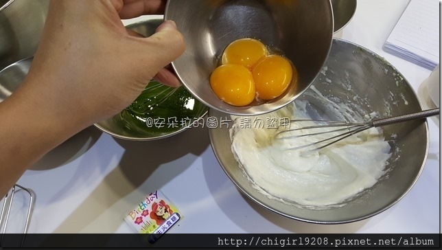 油與牛奶攪拌均勻後,依序再加入D粉,蛋黃