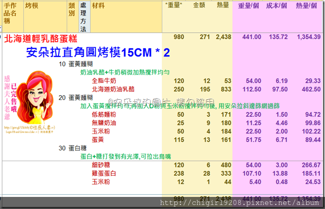 "安朵拉實作的手作品:北海道輕乳酪蛋糕 成本熱量分析如下.
