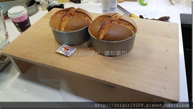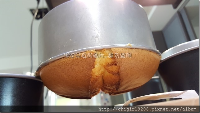 但結果是.. 沒烤很熟.. 還有水氣... 所以蛋糕沒有抓力.. 自然倒扣就掉下來了.. 是OK.. 但.. 卻不是這樣蛋糕的特色. \